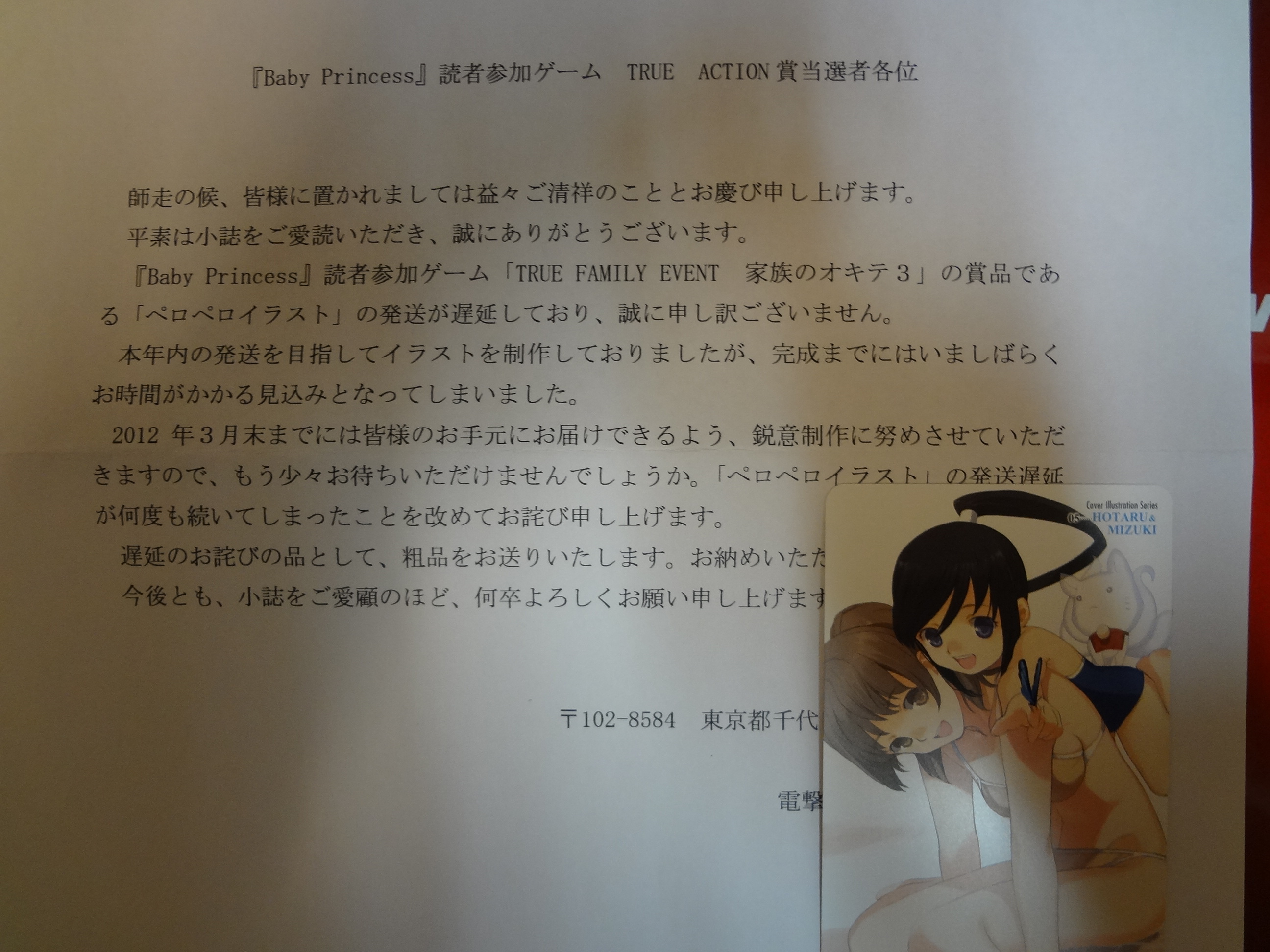 2012年3月 再度発送遅延のお知らせ。次は6月末予定
